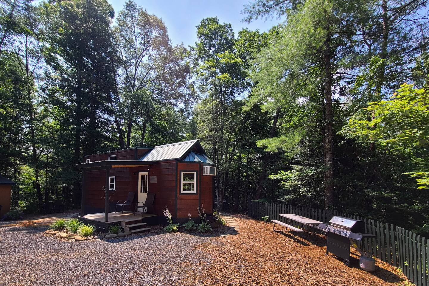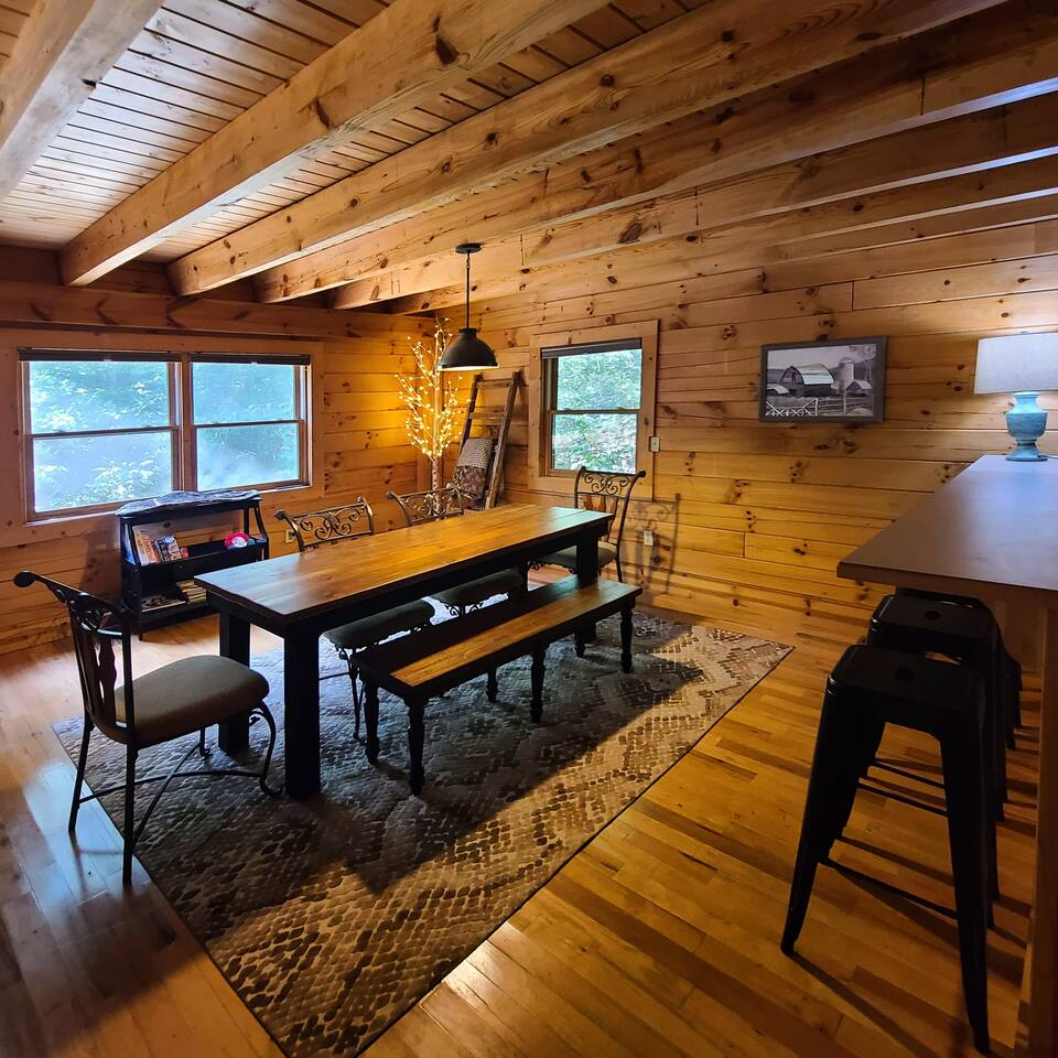 Two houses with one reservation: Cabin: • 3 beds • Full kitchen • 2 full bathrooms • Covered deck with rocking chairs • Outdoor deck with grill and picnic table Tiny House: • Queen bed • Full kitchen • Full bathroom • Outdoor hammock • Front covered porch • Private back deck Relax on the outdoor decks, fire up the grill, or unwind in the hammock after a day of exploring the nearby attractions. Both properties are conveniently located near Cherokee, providing easy access to: • Harrah's Cherokee Casino Resort (11 minutes) • Cherokee Indian Reservation (11 minutes) • Great Smoky Mountains National Park (17 minutes) • Great Smoky Mountain Railway (13 minutes) • Downtown Bryson City (11 minutes) • Downtown Sylva (19 minutes) • Oconaluftee Indian Village (13 minutes) • Mingo Falls (25 minutes) • Sequoyah National Golf Club (7 minutes) • Nantahala Outdoor Center (23 minutes) Discover a delightful retreat for your group in the heart of Whittier, offering a combined stay in our cozy log cabin and charming tiny house, both designed in a semi-rustic style. This unique combination can accommodate up to 8 guests, making it an ideal setting for families and friends seeking a memorable mountain getaway together. Whether you're seeking adventure or relaxation, our combined retreat provides the perfect base for your Whittier stay. Book now and create unforgettable memories with your loved ones!