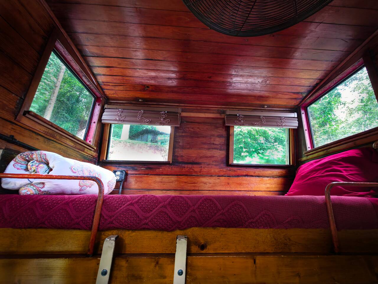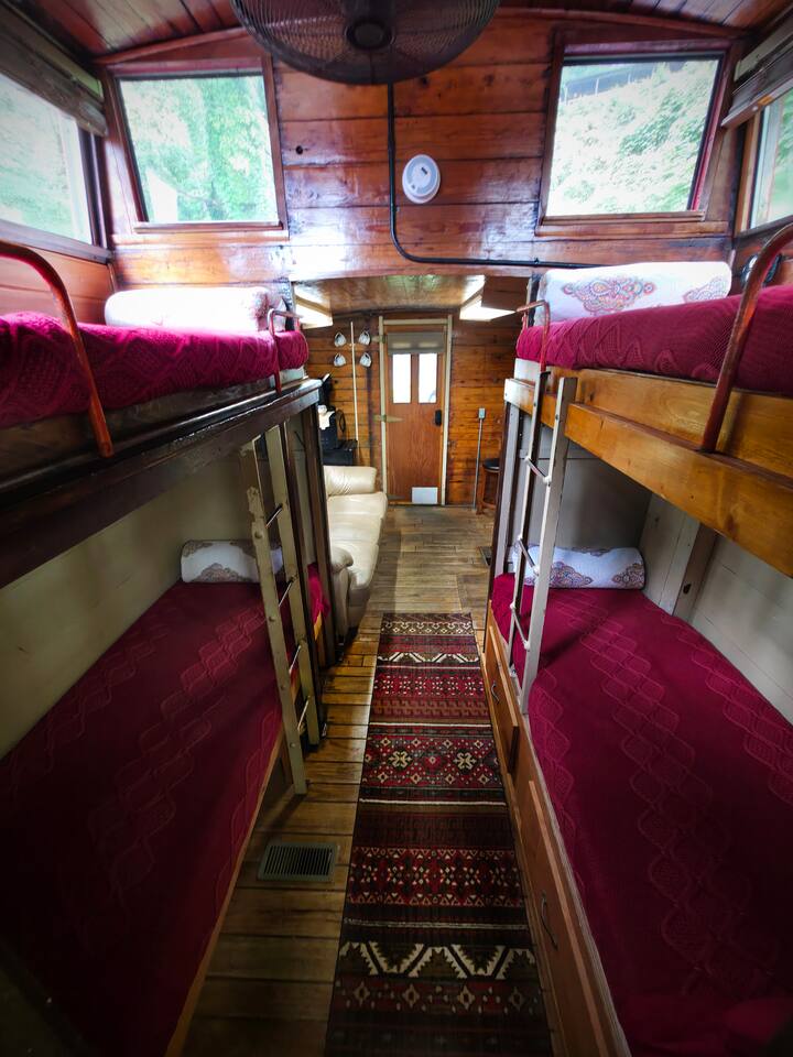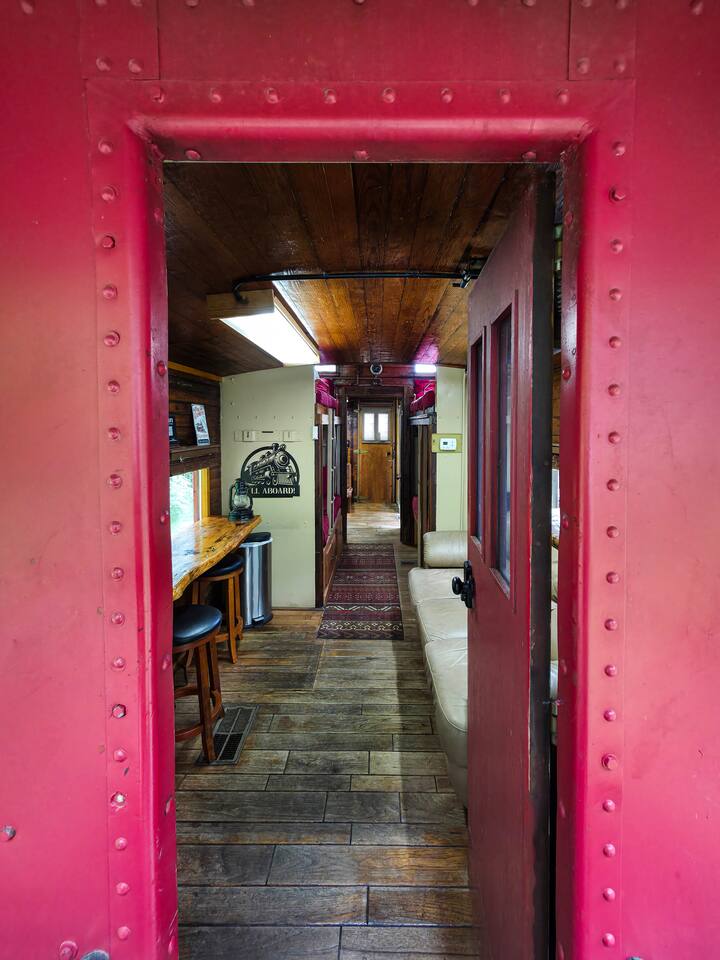 • Climate Control: The caboose is fully climate-controlled with both air conditioning and heating for year-round comfort. • Upper Bunks: The two upper bunks are accessed by ladder and may not be suitable for young children, those with mobility issues, or guests uncomfortable with heights. • Kitchenette Limitations: The caboose features a hotel-style kitchenette with mini-fridge, microwave, and coffee maker only. There is not a stove, oven, or kitchen sink in this unit due to space limitations. • Authentic Experience: While we've added modern comforts, this is a genuine historic train car with original hardwood flooring that shows its age and character. The space has a rustic, compact charm that appeals to those who appreciate vintage authenticity over polished perfection. Ideal for travelers who value unique history and are comfortable with the beautiful imperfections of a preserved piece of railroad heritage. • Polar Express Season: The caboose books quickly during November-December when the railway runs its popular Christmas-themed train experience.